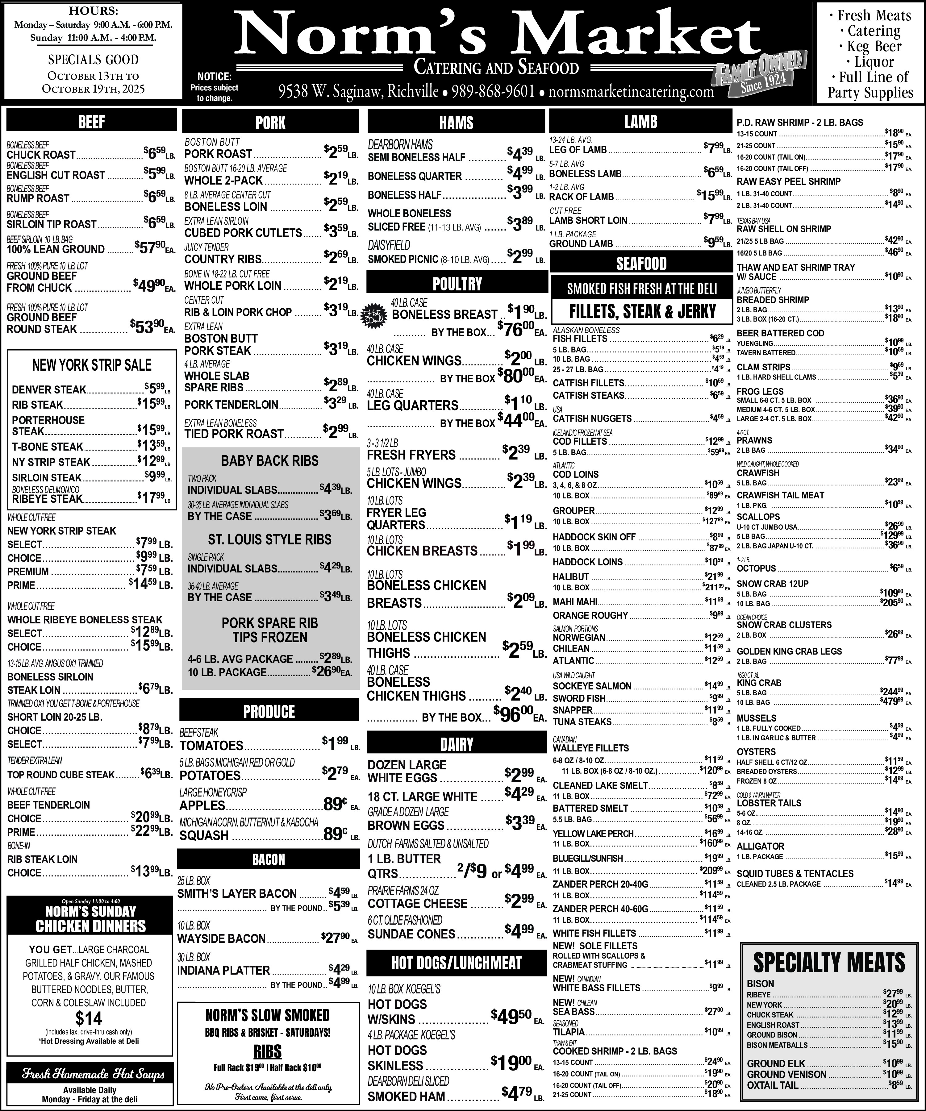 Nothing beats eating a home-cooked meal, especially slow smoked ribs and brisket. If you're craving a homemade dish, stop by Norm's Market & Catering in Reese and Richville, MI. We have everything from chicken dinners to daily soup specials. Whether you're a vegetarian or meat lover, we have something for you.